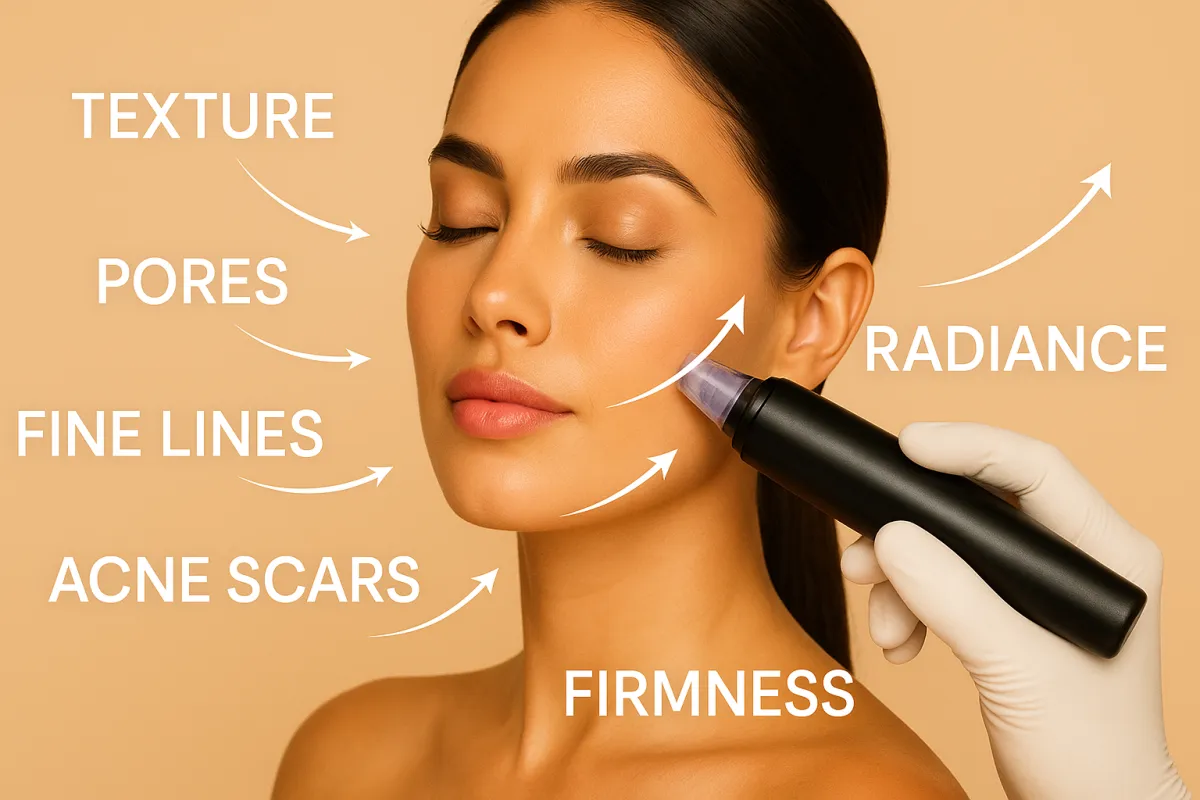 Loved by celebs. Backed by science. RF Microneedling combines microneedling with radiofrequency energy to treat deeper layers of the skin—supporting collagen + elastin for a smoother, firmer look with minimal downtime.